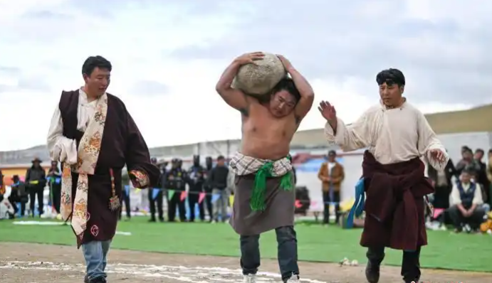 體育競賽環節亮點突出,參賽馬匹按身高科學分組,專設4歲以下小馬組別,共設13個賽事及2項傳統馬術項目,賽馬單項最高獎金達15萬元(人民幣)。民眾體育版塊將舉辦抱石頭、吾爾朵等四項民眾體育賽事,以及第二屆農牧民趣味運動會。 圖為那曲恰青賽馬節抱石頭比賽現場。 貢嘎來松 攝